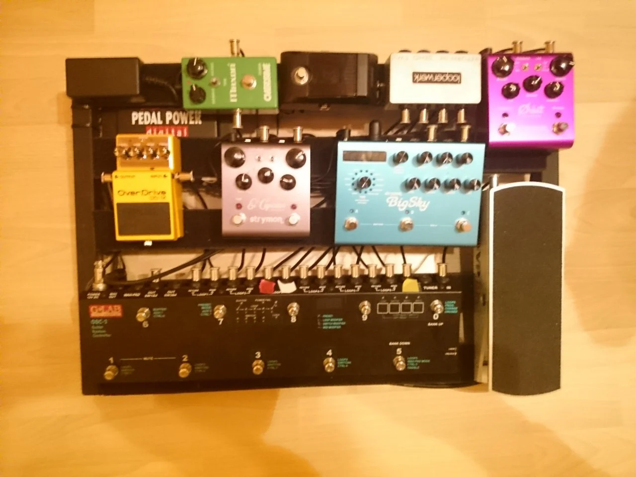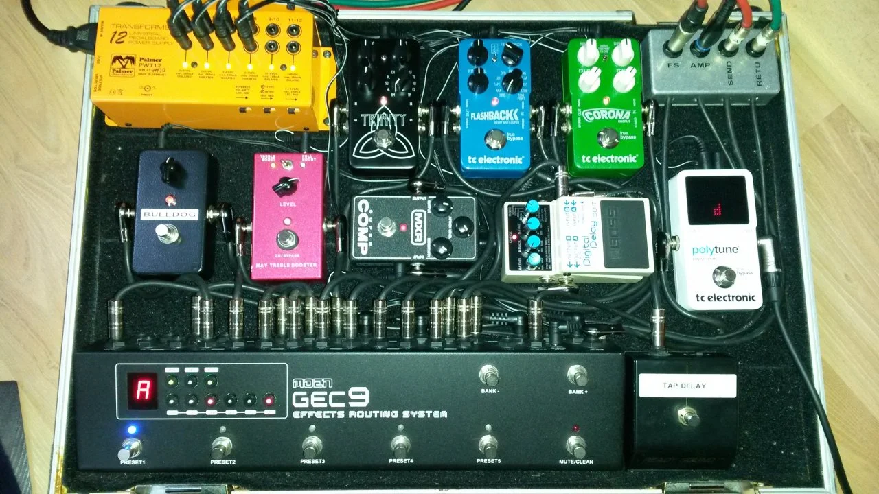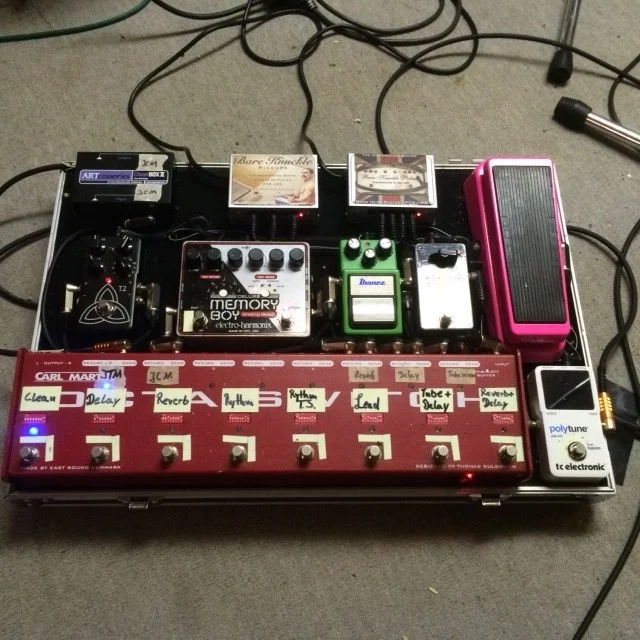 An dem "Haupt-Delay" ändere ich für ein paar Songs die Delay-Zeit, deshalb das Klebeband mit Markierungen an dem Time-Poti. Das funktioniert noch ganz gut, weil ich nur zwei bis drei verschiedene Zeiten brauche.