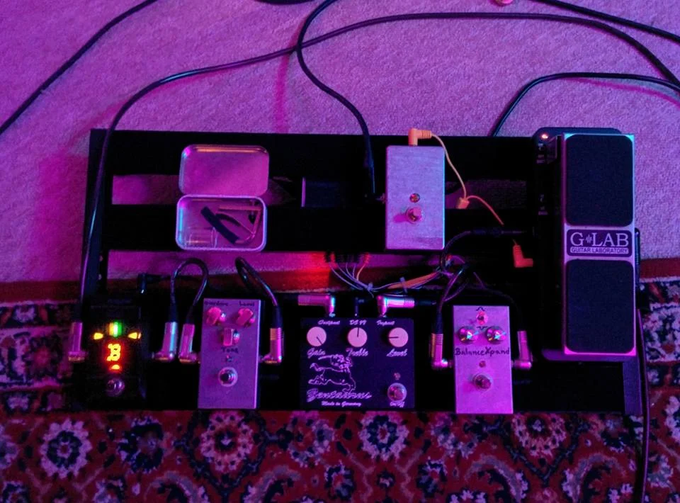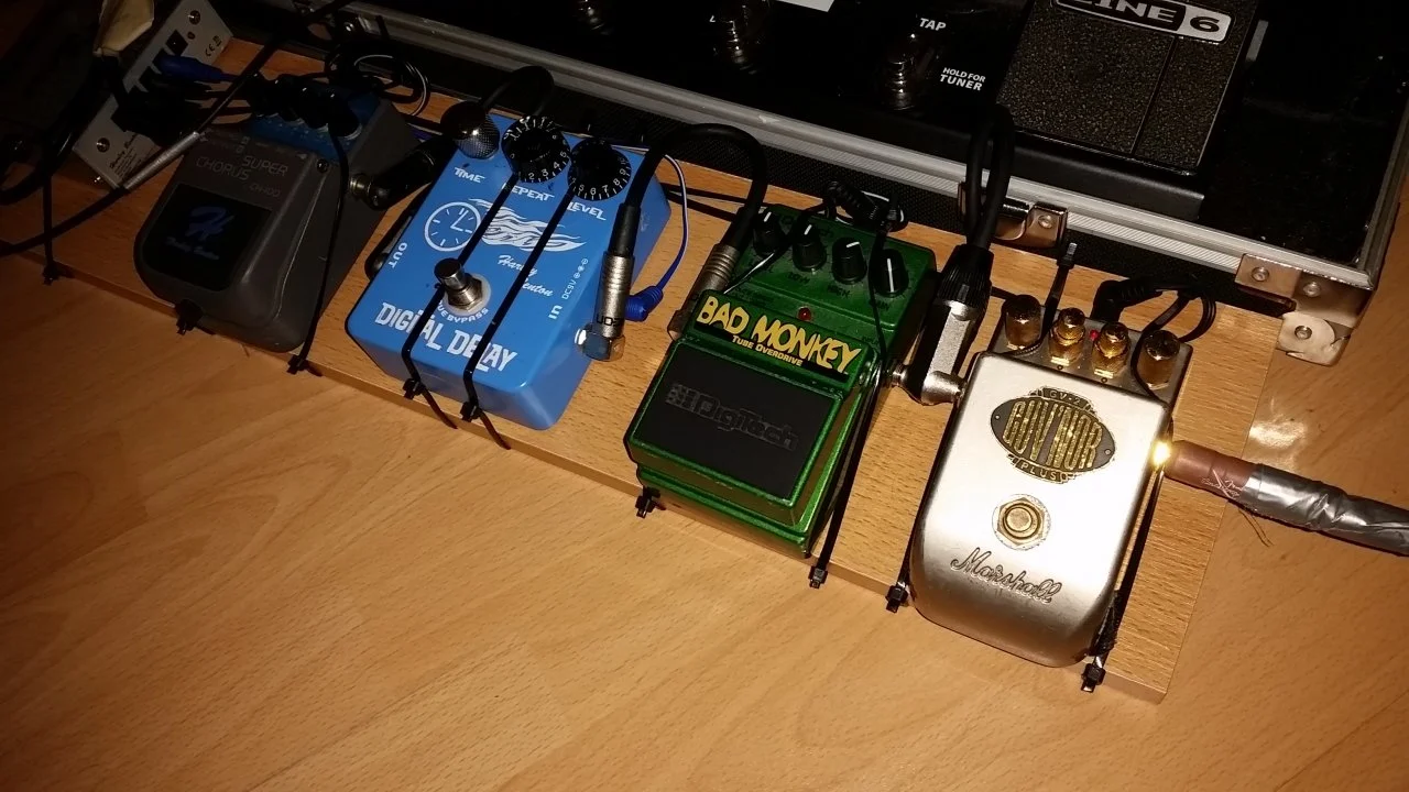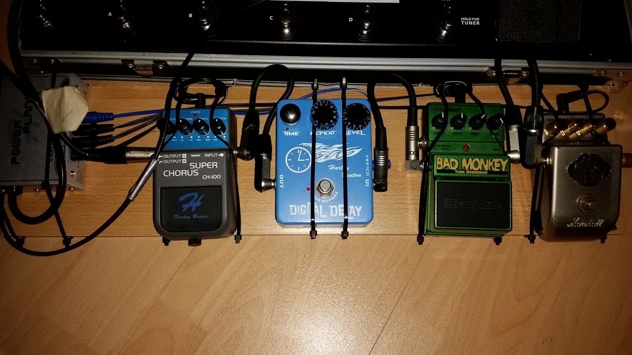 Ich habe momentan Lehle D.Loop, CryBaby Wah, RM Voodoo Vibe, Hotone Soul Press, Fulltone MDV 3, dann TC Electronic Polytune Mini und in der Amp FX Loop TC Electronic Hall of Fame, Lehle Dual SGoS, TC Electronic Flashback, T-Rex Replay, MXR MC 402 daran hängen. Also eine ganze Menge Zeug.