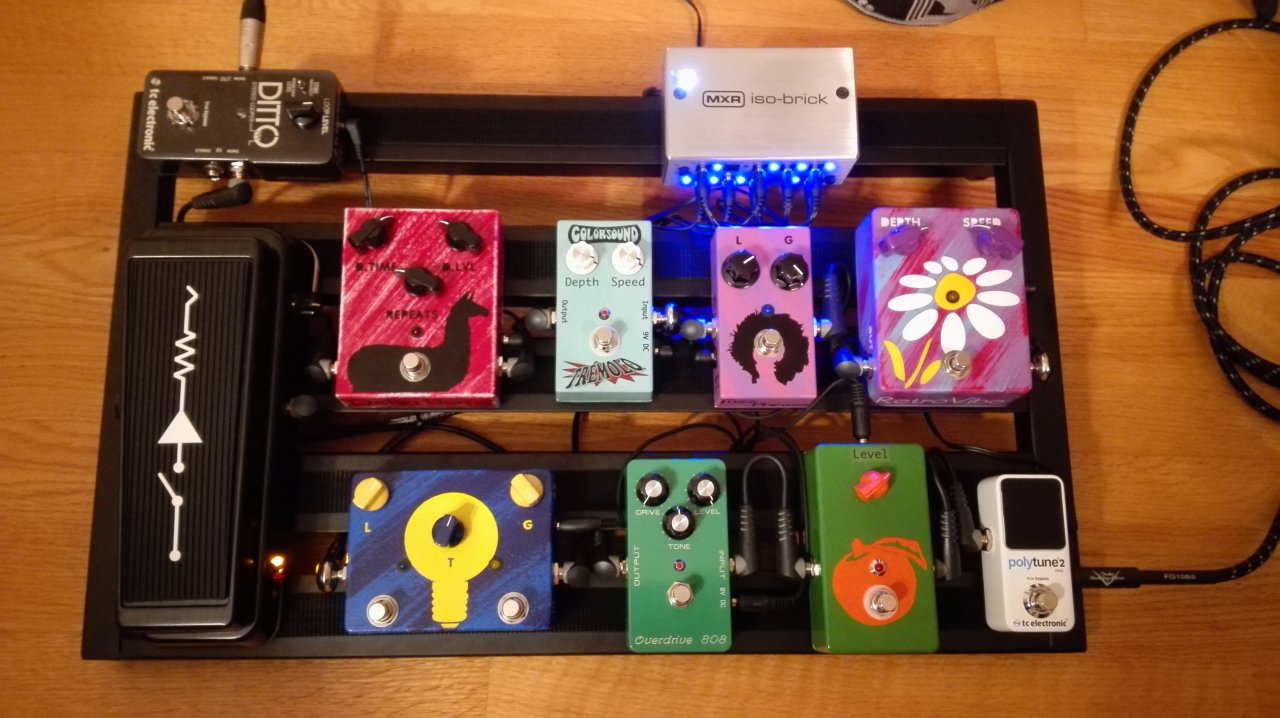 nach mehrmonatigem Sammeln von Tretminen, Pedal-Tetris und gefühlt endlosem Planen + Recherche (Hauptsächlich wegen der Stromversorgung) habe ich endlich mein Wunsch-Pedalboard fertig zusammengestellt und bin verdammt zufrieden.