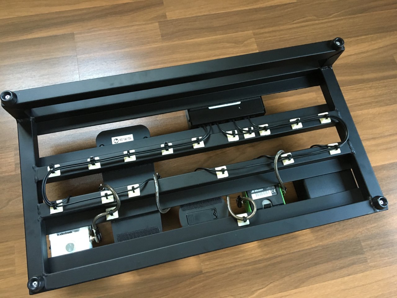 Und wie man sieht wird's ja jetzt schon wieder knapp, deswegen kommt eine Etage auf das Board wie man es auch häufig bei den Gigrig Custom Boards von Daniel Steinhardt sieht, so dass man die Effekte unten immer noch bedienen kann bei den Knöpfen.