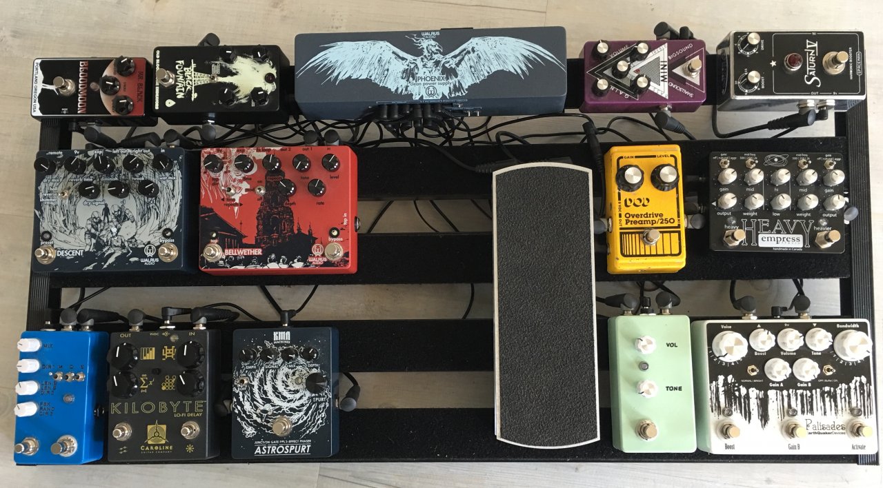 Reihenfolge: Gitarre -> Patchbox-Buffer -> Polytune -> Phase 45 & 90 Klon von Musikding in einem Gehäuse -> BigMos-Muff Klon -> Musikding der Screamer 808 -> Amp -> TC Corona -> Musikding Das Tremolo -> Carbon Copy -> TC Hall of Fame -> Digitech Jamman -> Amp.