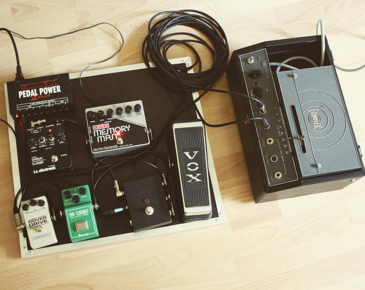 Ich hab mir für die nächste Probe einfach mal schnell ein kleines Just-for-Fun-Board zusammengestellt, weil ich mal ein bisschen Abwechslung brauch. Nur Tubescreamer, Wah, Vibe wird manchmal ein bisschen langweilig.