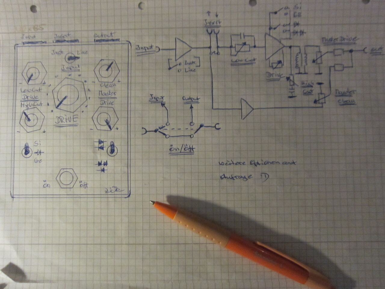 eine eingangsbuchse mit dahintergeschaltetem buffer , von da aus geht es dann zu einer weiteren verstärkerstufe , die das beimischbare cleansignal auf den pegel der zerrstufe anhebt .