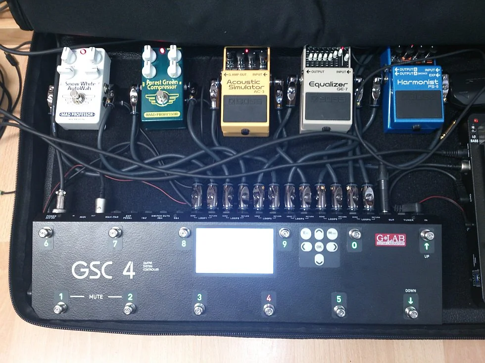 Da ich das G LAB GSC-4 zusammen mit insgesamt 6 Pedalen, einem WhaWha sowie einem Funksystem für die Gitarre einsetze, habe ich hierfür ein großes Pedalboard gekauft.