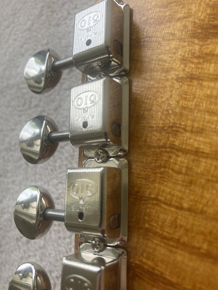 Traumhaft. Die Tuner laufen absolut gleichmäßig mit angenehmem Wiederstand, völlig spielfrei und sahnig. So soll es sein! Tatsächlich stehen die Achsen der Mechaniken kerzengerade und Wackelfrei in den Bushings, so ist das bekanntlich nicht immer!