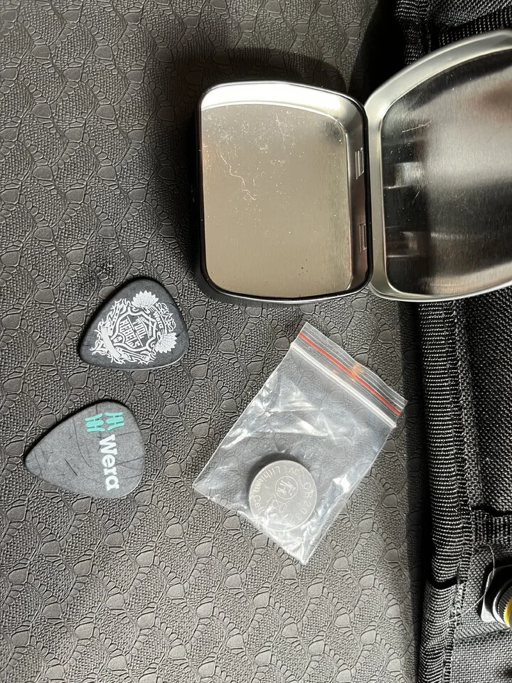 Praktisch finde ich die beiliegende kleine Dose. Da lege ich immer die Schrauben ab, damit ich während der Arbeiten keine verliere. Des Weiteren habe ich immer eine passende Knopfzelle für die Tuner drin.