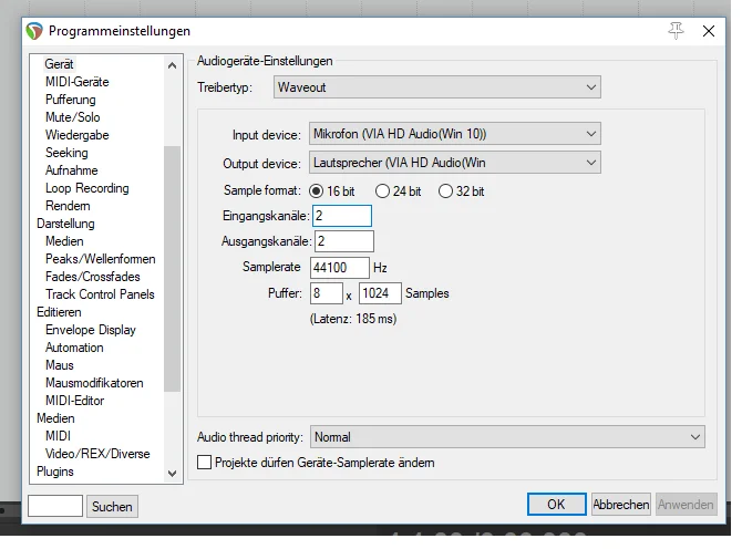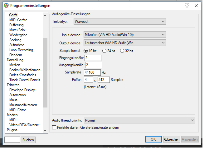Wenn ich die Pufferrate der Samples runterstelle von 8 x 1024 auf 4 x 512 wird die Latenz besser.