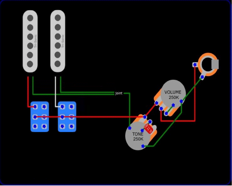 Mein Plan ist es zwei Singlecoils so zu verkabeln dass ich mit zwei 2wege Schaltern die Tonabnehmer jeweils an und aus schalten kann. Ich könnte zwar einfach einen normalen 3 Wege Schalter nehmen und mich am Diagramm einer Teile bedienen aber ich hab eben noch die anderen Schalter hier.